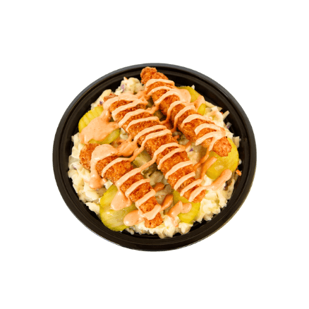 Our Yummy Chicken Salad features crispy chicken tenders atop fresh coleslaw, crunchy pickles, and a drizzle of our signature sauce — a perfect balance of crisp, tangy, and savory in every bite.